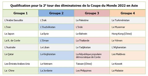 En principe, les équipes du même groupe de départ ne peuvent pas appartenir au même groupe de qualification. Par conséquent, l’équipe vietnamienne évitera surement des adversaires puissants se trouvant dans le même groupe 2, notamment l’Irak, la Syrie, l’Ouzbékistan et la Jordanie.