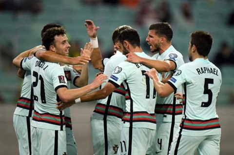 | La joie des Portugais, après un but marqué contre l'Azerbaïdjan, lors des qualifications pour le Mondial-2022 au Qatar, le 7 septembre à Bakou. |