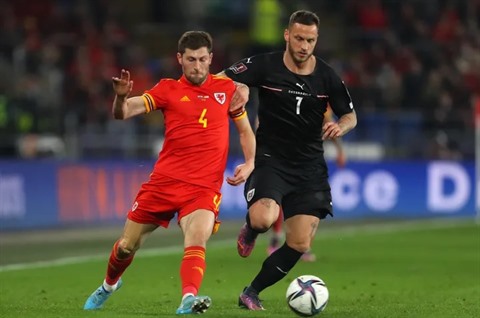 | Le défenseur gallois Ben Davies (N°4) tente de stopper l'attaquant de l'Autriche, Marko Arnautovic, en prébarrage du Mondial à Cardiff, le 24 mars 2022. |