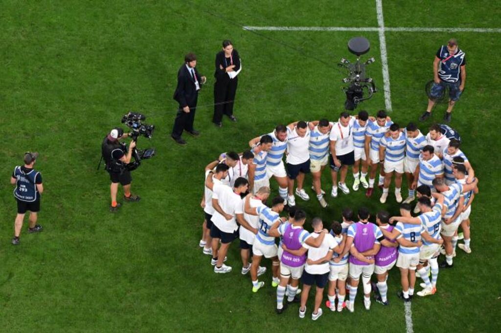 | Les joueurs argentins se regroupent sur la pelouse du Stade vélodrome le 9 septembre 2023 après leur défaite 27-10 face à l'Angleterre. |