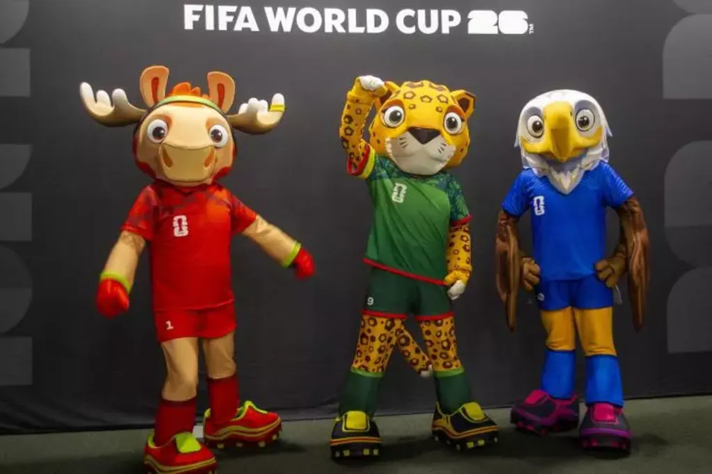 | Les mascottes officielles de la Coupe du monde 2026 représentant les pays hôtes - l’élan canadien (gauche), l’aigle américain (droite), et le jaguar mexicain, - sont présentées au stade BBVA de Monterrey, au Mexique, le 24 octobre. |