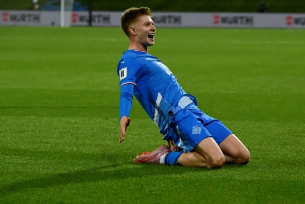 | L'Islandais Kristian Nokkvi Hlynsson célèbre son but égalisateur lors du match contre la France, le 13 octobre 2025 à Reykjavik. |