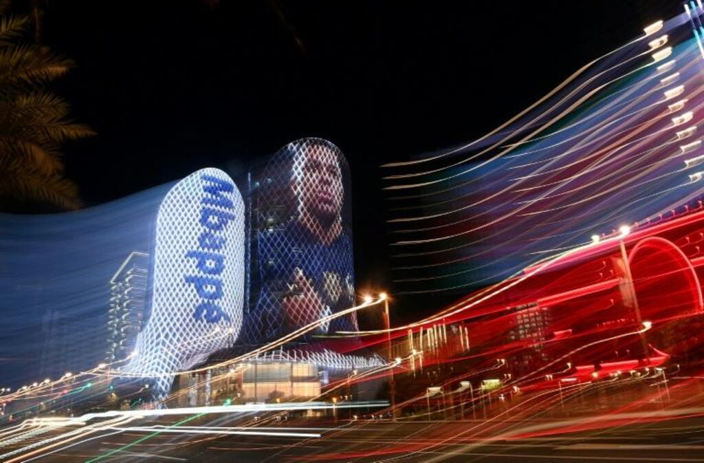 | Le portrait de Kylian Mbappé affiché sur les "Twin Towers" d'al-Jaber à Doha le 6 décembre 2022. |