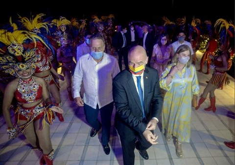 | Le président de la FIFA, Gianni Infantino (centre), avec celui de la Fédération colombienne Ramon Jesurun lors de l'inauguration de son antenne à Barranquilla, le 13 octobre. |