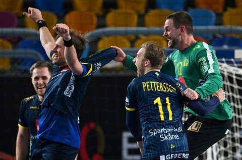 | Le gardien suédois Andreas Palicka (droite) fêtent avec ses coéquipiers la victoire sur la France en demi-finale du Mondial, le 29 janvier |