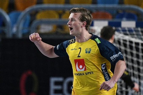 | Le Suédois Jonathan Carlsbogard lors de la finale du Mondial de handball face aux Danois, le 31 janvier 2021 au Caire. |