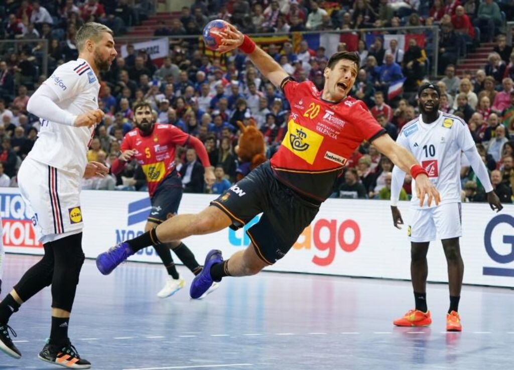 | Le pivot espagnol Abel Serdio Guntin (centre) tire au but contre la France lors du Mondial de hand, le 22 janvier à Cracovie. |