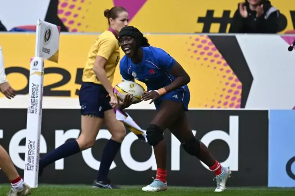 | Nassira Konde après avoir marqué un essai pour la France contre l'Angleterre en demi-finales du Mondial 2025, le 20 septembre à Bristol |