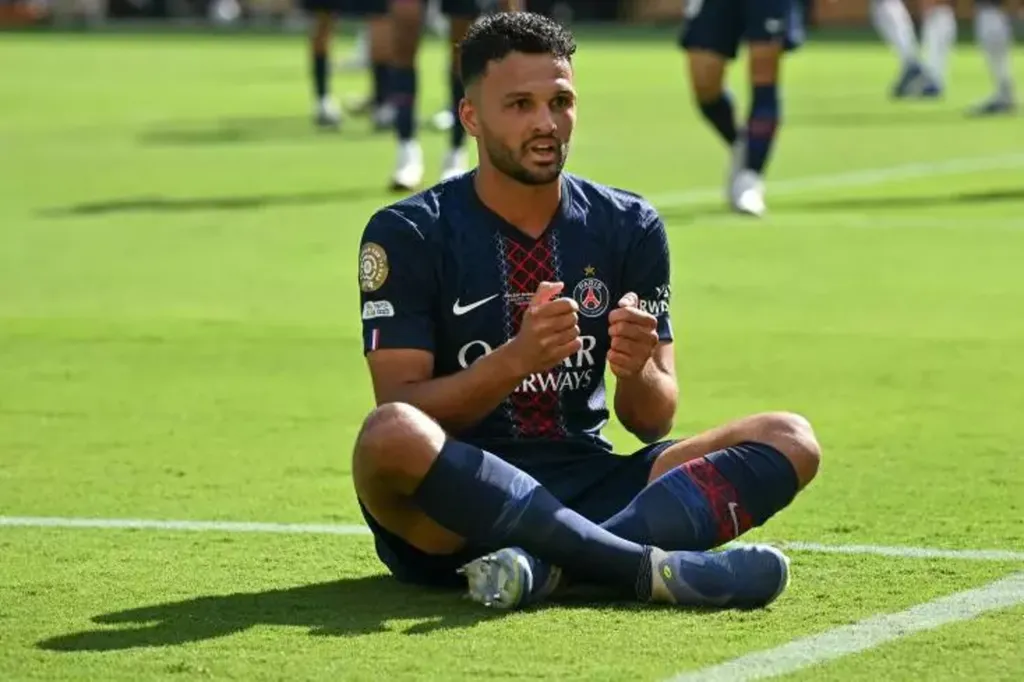 | Gonçalo Ramos célèbre un but lors de la demi-finale du Mondial des clubs remportés par le PSG contre le Real Madrid, le 9 juillet à East Rutherford. |