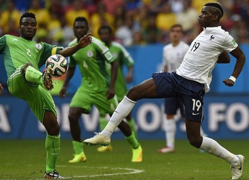 | Paul Pogba (No19) face au capitaine du Nigeria Joseph Yobo (N02) au stade Mane Garincha à Brasilia, le 30 juin. Photo : AFP/VNA/CVN |