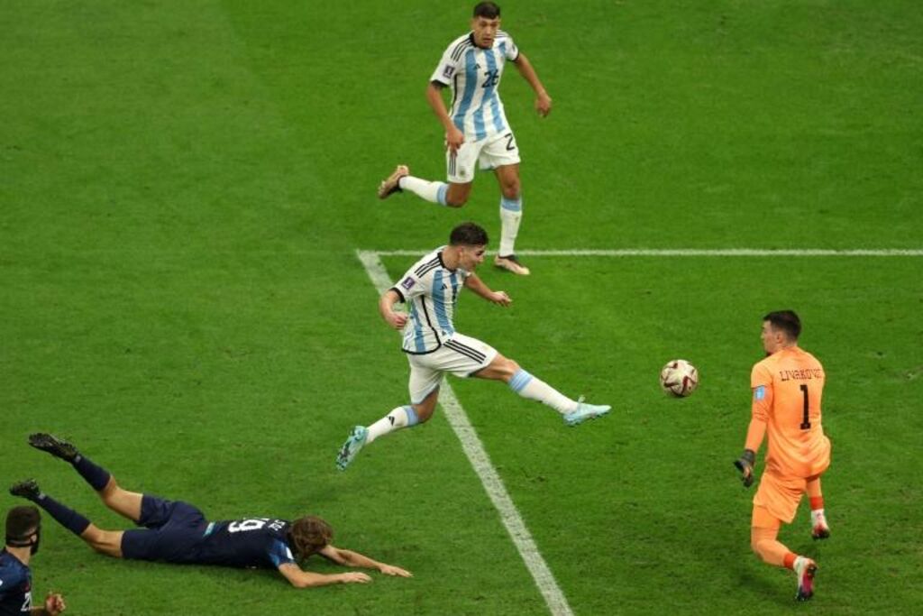 | L'attaquant Julian Alvarez inscrit le deuxième but argentin face à la Croatie lors du match de demi-finale du Mondial-2022, le 13 décembre à Doha. |