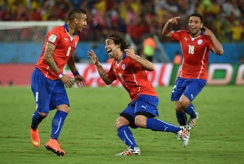 | L'attaquant chilien Jorge Valdivia (centre) célèbre un but en compagnie du milieu de terrain Arturo Vidal (gauche) lors du match contre l'Australie à Cuiaba, au Brésil, le 13 juin. Photo : AFP/VNA/CVN |