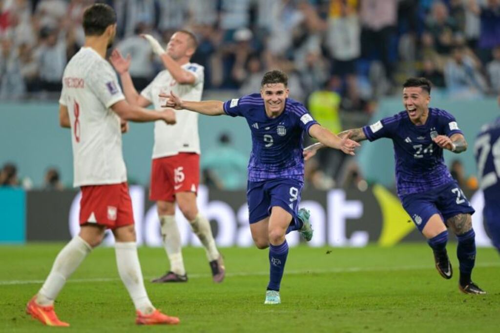 | L'attaquant Julian Alvarez (centre) vient de marquer le deuxième but de l'Argentine contre la Pologne, le 30 novembre. |