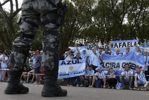 | Des supporteurs argentins à Porto Alegre, avant le match de poule contre le Nigeria, le 24 juin. Pour la finale dimanche, la Police militaire devrait placer 2.500 agents dans les rues de Rio de Janeiro. Photo : AFP/VNA/CVN |