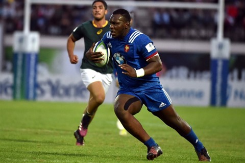 | Le N°8 français Jordan Joseph à l'attaque face à l'Afrique du Sud au Mondial des moins de 20 ans, le 7 juin à Narbonne. |
