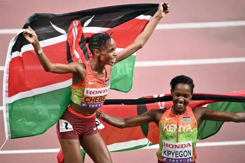 | Les Kényanes Beatrice Chebet (gauche) et Faith Kipyegon célèbrent leur doublé sur 5.000 m aux championnats du monde d'athlétisme de Tokyo le 20 septembre. |