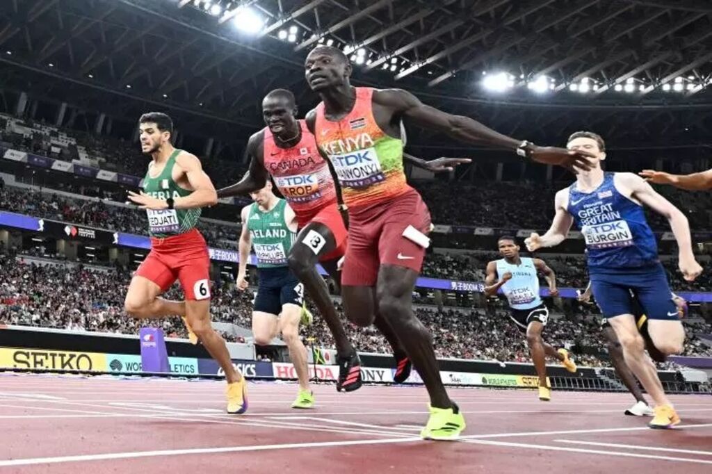 | Le Kényan Emmanuel Wanyonyi franchi en tête la ligne d'arrivée du 800 m aux championnats du monde d'athlétisme de Tokyo le 20 septembre. |
