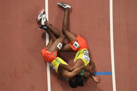 | Les Éthiopiens Muktar Edris et Telahun Bekele après le 5.000m aux Mondiaux de Doha le 30 septembre. |