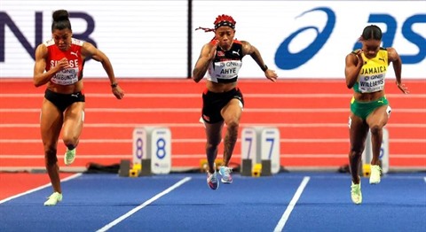 | La Suissesse Mujinga Kambundji, la Trinidadienne Michelle-Lee Ahye et la Jamaïcaine Briana Williams en finale du 60m à Belgrade, le 18 mars. |