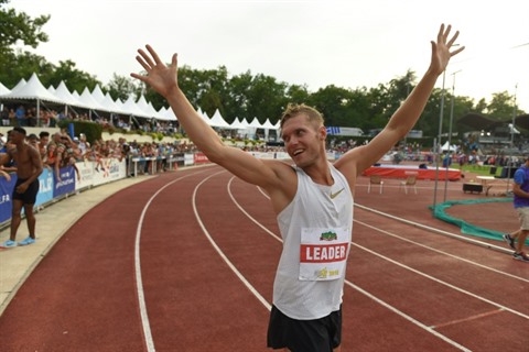 | Le décathlonien Kévin Mayer exulte après avoir battu le record du monde lors du Decastar, le 16 septembre 2018 à Talence, en Gironde. |