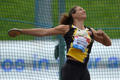 | La discobole française Mélina Robert-Michon au meeting Ligue de diamant de Birmingham, le 18 août. |