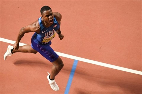| L'Américain Christian Coleman après sa victoire au 100 m des championnats du monde d'athlétisme, le 28 septembre à Doha. |