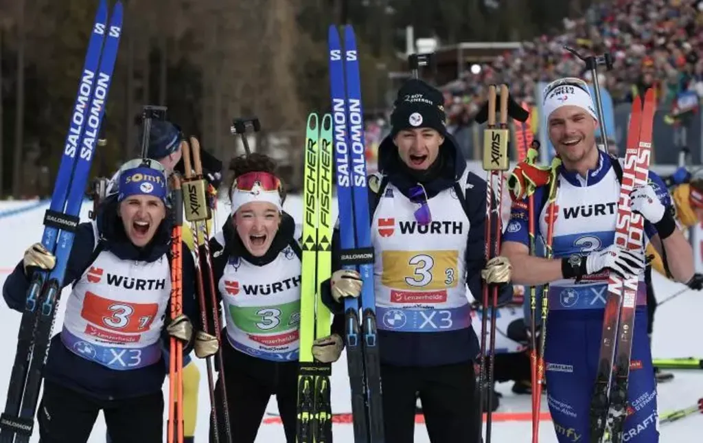 | (De gauche à droite) : les Françaises Julia Simon, Lou Jeanmonnot-Laurent, Eric Perrot et Emilien Jacquelin célèbrent après avoir remporté le relais mixte des championnats du monde de Biathlon à Lenzerheide en Suisse. |