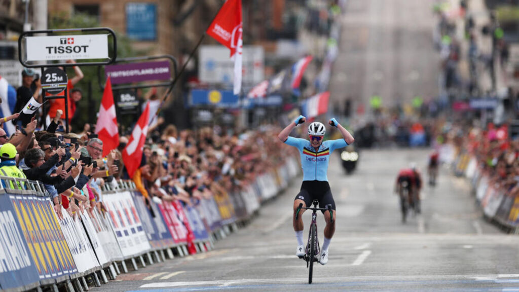 | La Belge Lotte Kopecky remporte le titre de championne du monde de cyclisme sur route à Glascow (Écosse), le 13 août. |