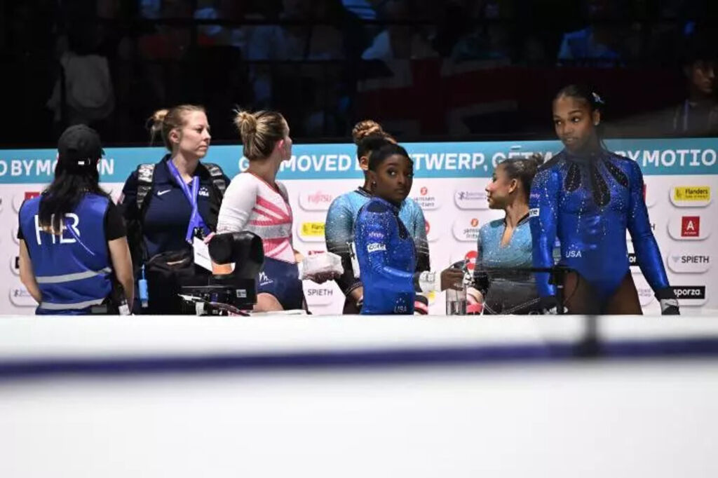 | Les gymnastes américaines Simone Biles (centre) et Shilese Jones (1re à droite) lors de la finale du concours général aux Mondiaux d'Anvers, le 6 octobre. |