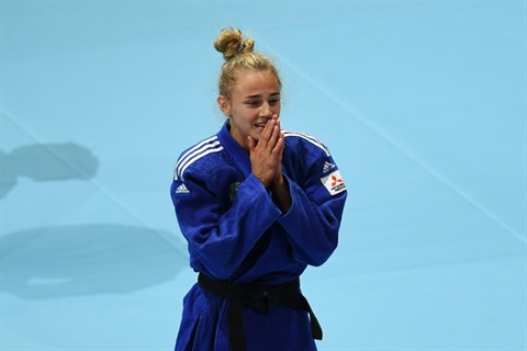 | La jeune judoka ukrainienne Daria Bilodid émue après son sacre en moins de 48 kg aux Mondiaux de Tokyo, le 25 août. |