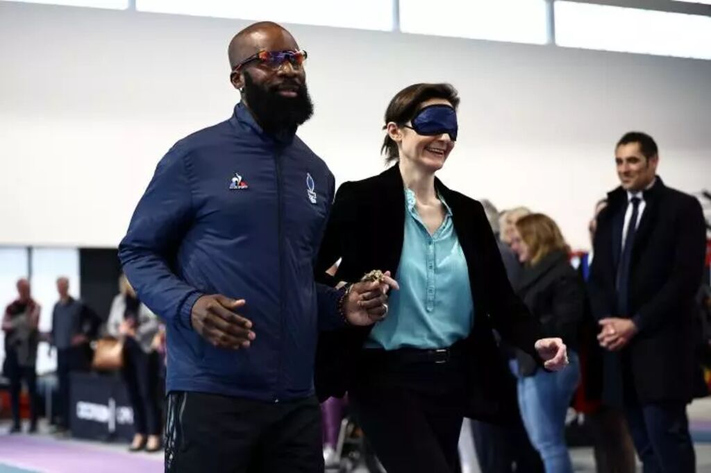 | La ministre française des Sports, Amélie Oudéa-Castera, marche les yeux bandés avec l'athlète français malvoyant Trésor Makunda lors d'une visite d'un club d'athlétisme inclusif, 500 jours avant l'ouverture des Jeux paralympiques de Paris 2024, à Cergy-Pontoise, le 17 avril. |