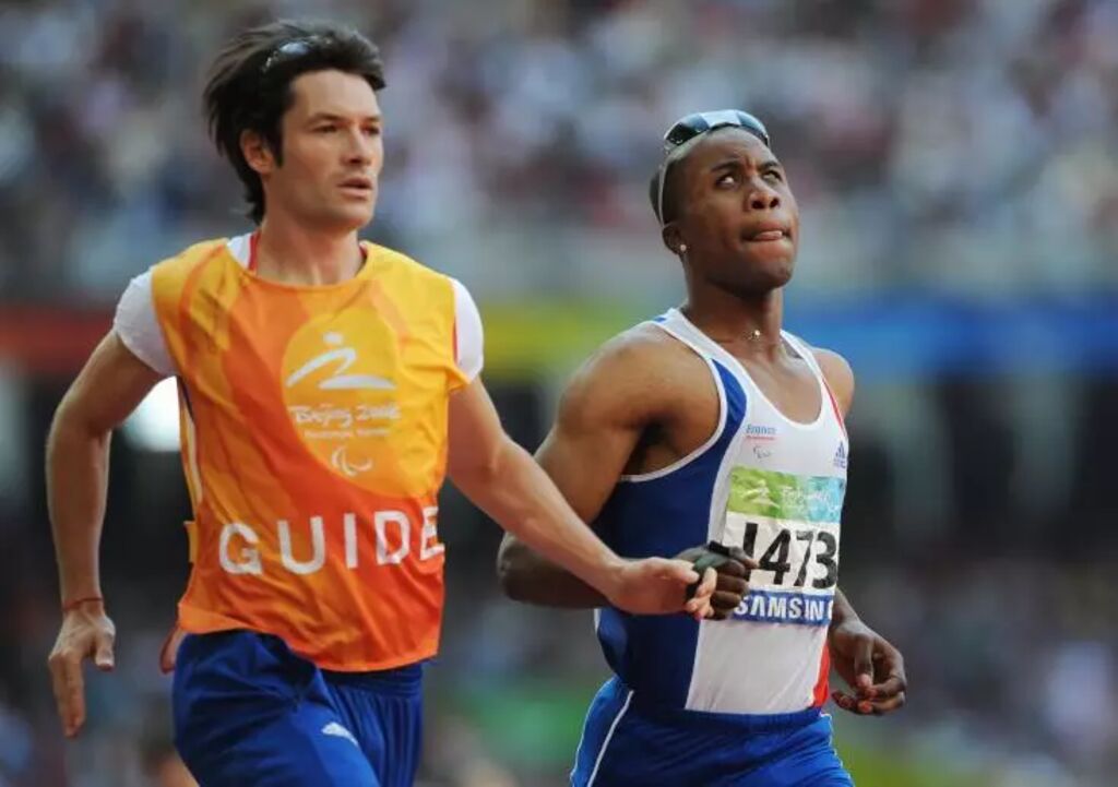 | Le Français Trésor Makunda (droite) court avec son guide lors d'un entraînement avant le début des éliminatoires de l'épreuve T11 du 200 mètre masculin aux Jeux Paralympiques 2008 à Pékin. |