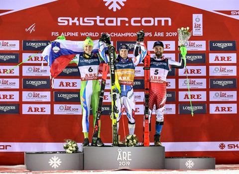 | Le Français Alexis Pinturault (centre) décroche son premier titre de champion du monde sur le combiné d'Are le 11 février. |