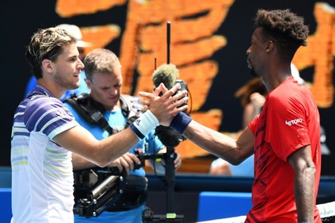 | L'Autrichien Dominic Thiem (gauche) serre la main du Français Gaël Monfils après l'avoir battu en 8e de finale de l'Open d'Australie, le 27 janvier à Melbourne. |