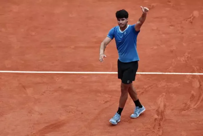 | L'Espagnol Carlos Alcaraz durant sa demi-finale gagnée contre le Monégasque Valentin Vacherot, au Masters 1000 de Monte-Carlo, le 11 avril. |