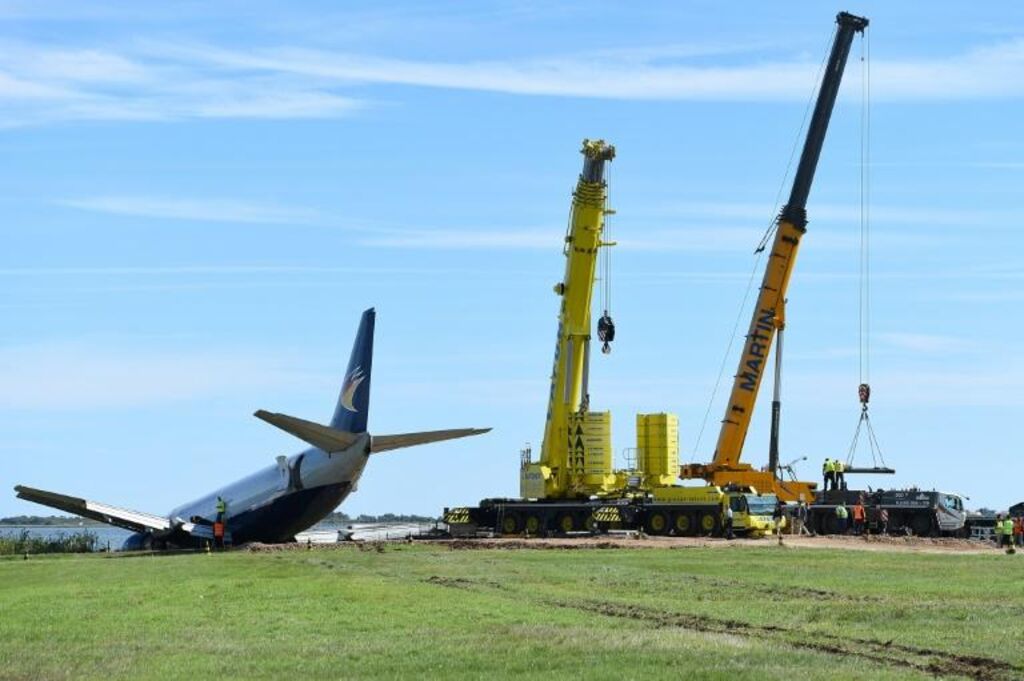 À l'aide de deux grues géantes, il a fallu soulever l'avion, le faire pivoter, puis le tracter jusqu'au tarmac pour le remorquer jusqu'aux abords d'un hangar où il restera immobilisé le temps de l'enquête, selon la direction de l'aéroport.