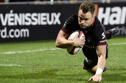 | L'ailier de Lyon Toby Arnold applatit un essai contre Oyonnax à Gerland, le 28 octobre 2017. |