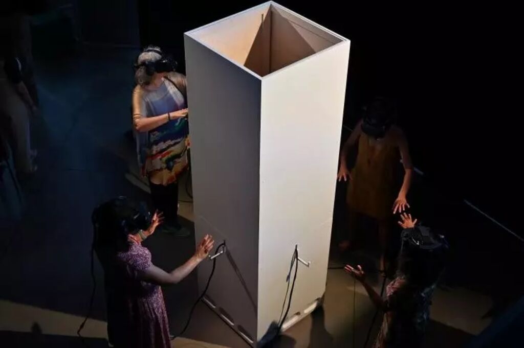 | Des personnes participent à l'expérience de réalité virtuelle "Chom5ky VS Chomsky", dans laquelle elles discutent avec une IA pour mieux comprendre son fonctionnement, à l'Office national du film du Canada, le 7 septembre à Montréal. |