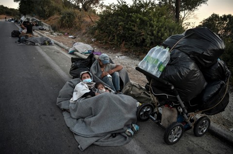 | Des migrants se réveillent après avoir passé la luit dehors à la suite des incendies dans le camp de Moria à Lesbos (Grèce) le 10 septembre. |