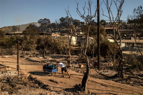 | Un migrant traverse le camp de Moria dévasté par un incendie, le 10 septembre. |