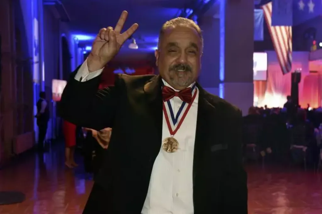 | Le tromboniste et légende de la salsa Willie Colon pause après avoir reçu un prix à New York, le 12 mai 2018. |