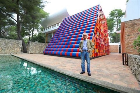 | Photo d'archive prise le 4 juin 2016 de 2016, l'artiste-plasticien Christo posant devant son œuvre +Mastaba+ à la Fondation Maeght à Saint-Paul-de-Vence (Sud-Est de la France). |