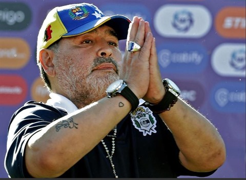 | Diego Maradona, alors entraîneur de Gimnasia La Plata, après un match de Superliga contre Estudiantes, à La Plata en Argentine, le 2 novembre 2019. |