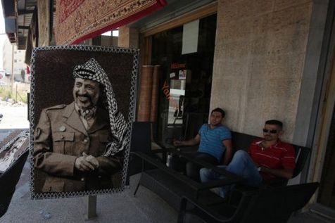 | Portrait du dirigeant palestinien Yasser Arafat dans un magasin de Ramallah. |