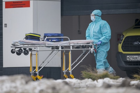 | Un travailleur médical portant un masque et des habits de protection pousse un chariot dans un hôpital de Kommunarka, en banlieue de Moscou, en Russie, le 27 novembre. |