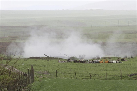 | Une unité d'artillerie arménienne à Martakert, dans le Haut-Karabakh, le 3 avril. |