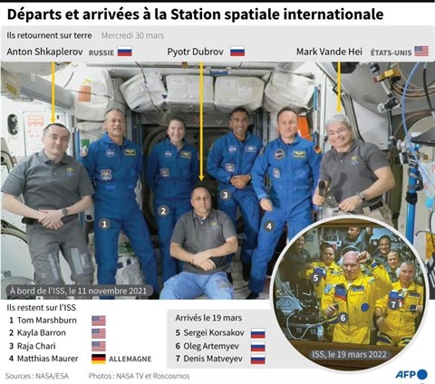 | Graphique montrant les 2 cosmonautes russes et l'astronaute américain rentrant sur terre le 30 mars et ceux qui restent sur la Station spatiale internationale (ISS). |