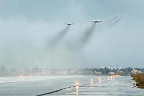 | Deux avions militaires russes décollent de la base militaire de Hmeimim en Syrie, le 16 mars. Photo: AFP/VNA/CVN |