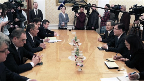 | Le ministre russe des Affaires étrangères, Sergueï Lavrov (3e, gauche), et l'envoyé spécial du président sud-coréen Chung Eui-yong (2e, droite). |