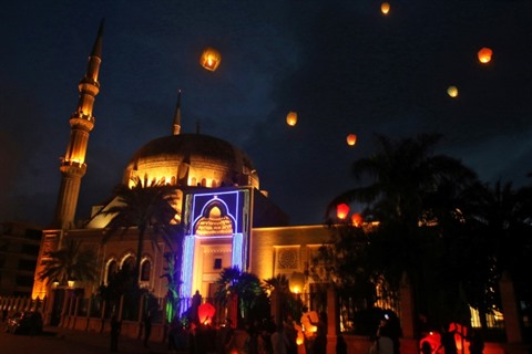 | Des Libanais lâchent des lampions devant un mosquée pour célébrer le début du ramadan, à Sidon, dans le sud du Liban, le 23 avril 2020. |